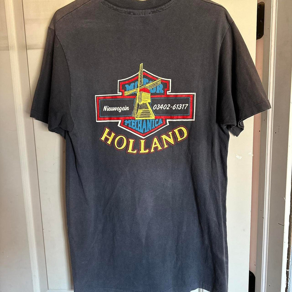 Authentic 1980s single stitch Harley-Davidson tee featuring a classic “America’s Pride” eagle graphic on front and rare Motor Mechanica Holland shop back print. Faded black cotton with perfect wear. Collectible international back hit from the Netherlands (Nieuwegein), complete with windmill and euro-style Harley logo. Doesn’t get more legit vintage than this.