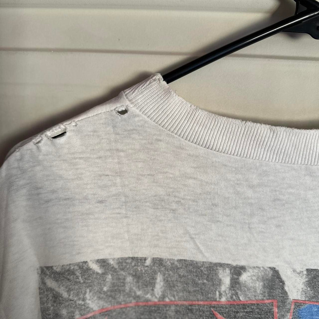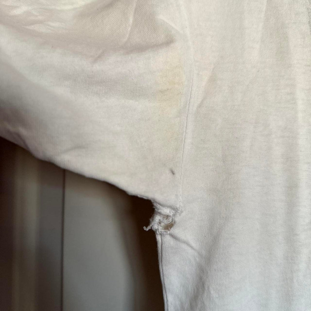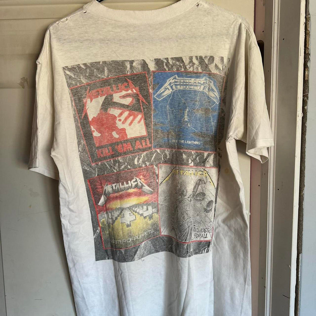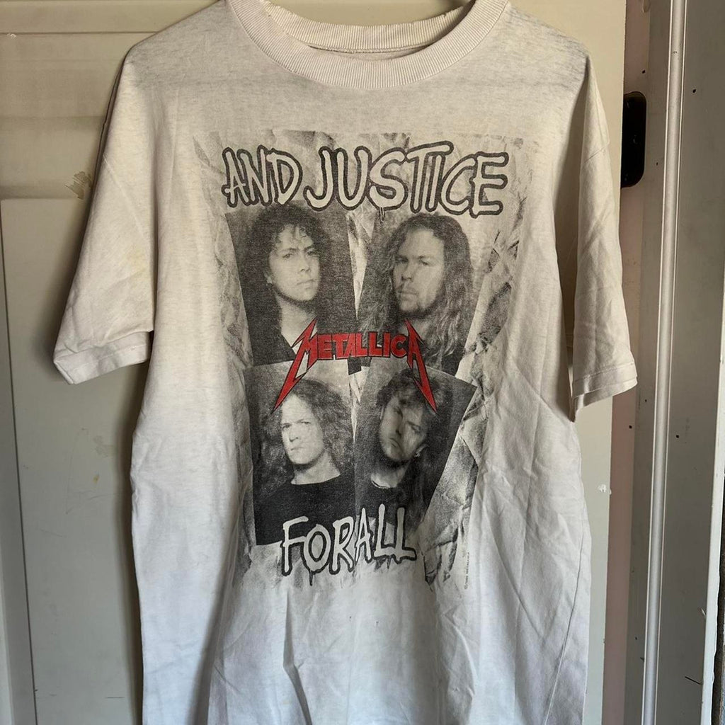 Crazy rare Metallica tee featuring the full band lineup from the “…And Justice For All” era. Black-and-white photocopy-style band photos over a crumpled-paper background with the red logo stamped dead center. White blank with a natural fade — super grungy, perfectly thrashed, and wearable.